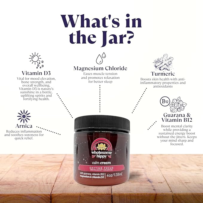 - Wholesome Hippy Daytime Focus Calm Cream – Energizing Body Butter with Magnesium, Vitamin B12, Guarana & Bergamot Orange – Moisturizing Wellness Cream for Daily Clarity – 4oz