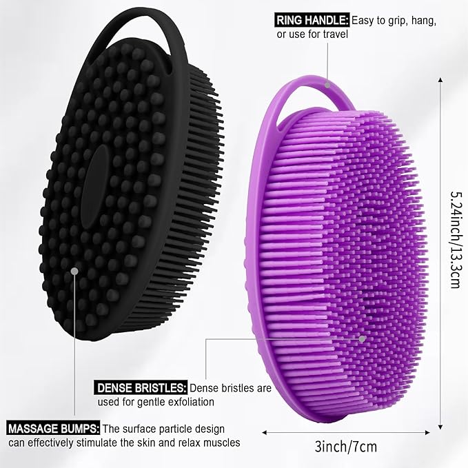 - Versatile Usage: The package includes two body scrubbers (purple/black). Beyond body washing, this exfoliating scrubber can be used as a face, scalp, and back scrubber in the shower, as a massage brush, and as a body or pet bath scrubber. It can also be used as a dish scrubber in the kitchen if needed. It's compact, portable, easy to use, and makes the perfect gift for any household.