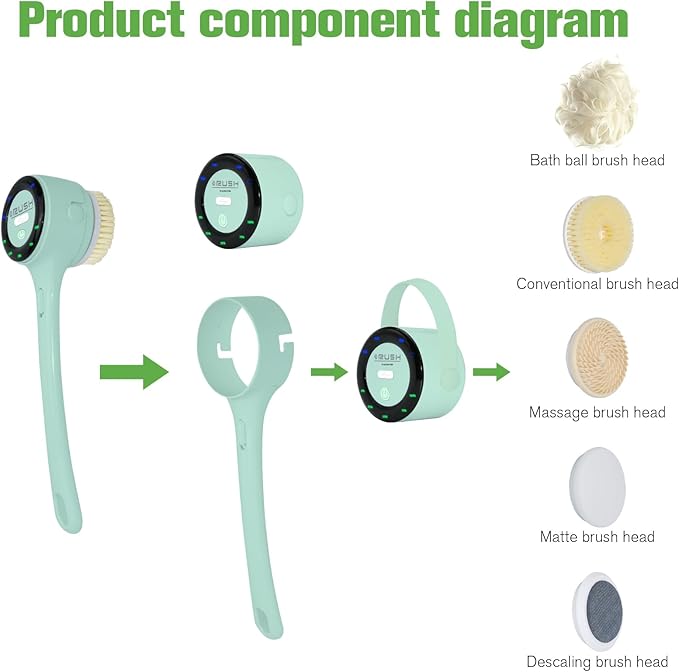 - Ipx7 waterproof/anti-slip design: The entire brush body is wrapped in silicone, and even the charging port is equipped with a silicone plug to prevent any water from entering The ergonomic long handle is equipped with a long detachable handle (14.5 inches) to help you clean hard-to-reach areas, especially the back. The handle is ergonomically designed for a comfortable grip. The top is equipped with hanging holes for easy storage and space-saving. It is a multi-functional electric body washer.