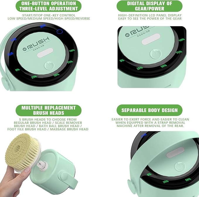 - Multi-functional bath brush: The electric bath brush is equipped with five different types of bath brush heads, including soft-bristled cleaning brush heads, bath brush heads, massage heads, scrubbing heads and grinding heads. This body bath brush is perfect for removing dead skin cells, oils and stains from the body, relaxing and comforting the entire body, etc. A set of electric body brushes can meet your various body cleaning needs