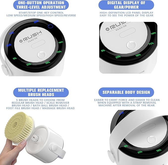 - Powerful and fast automatic rotation: The automatic rotation cleans all parts of the body more effortlessly than traditional shower brushes. With 3 adjustable speeds, you can adjust them according to your needs. Deeply and gently cleanse your body and skin pores, keeping your skin fresh and clean all day long