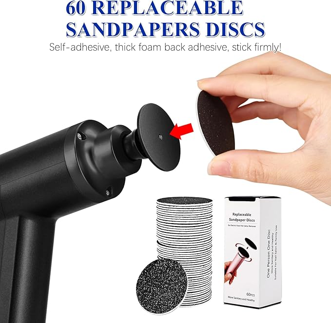 - 60PCS FOAM ADHESIVE BACKING SANDPAPER: It comes with 60 replaceable sandpapers, self-adhesive, thick foam backing, so it will stick firmly to the electric foot file and won't fall off during operation. After use, it can also be easily removed from the machine.