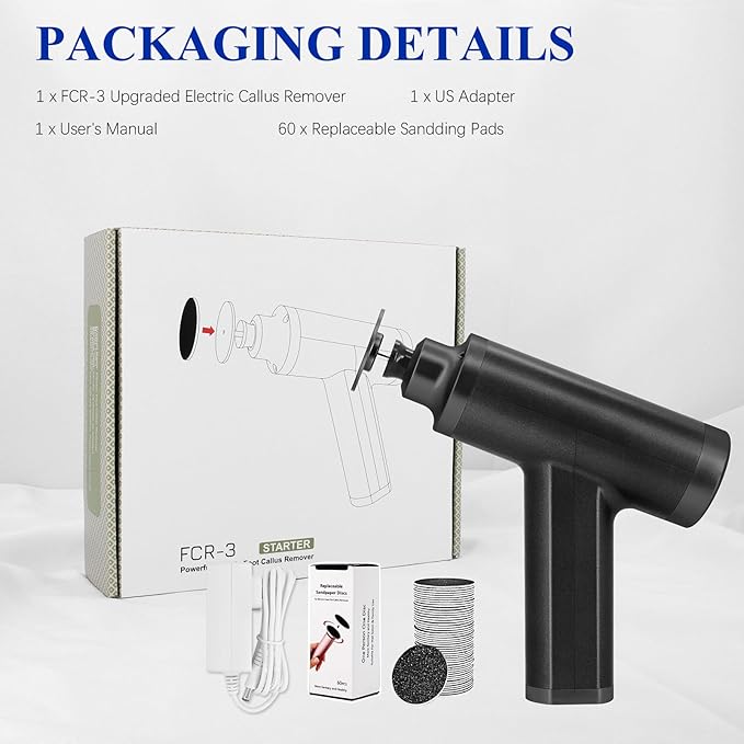 - PACKAGE DETAILS: 1*FCR-3 Professional electric foot sander,black, 1*Box of 60 replacement sandpaper discs, 1*US plug, 1*User manual.