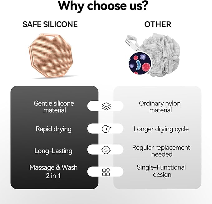 - Premium & Long-Lasting Material: Made from high-quality, eco-friendly silicone, this silicone bath scrubber is durable, hygienic, and built to last. It's the superior, modern alternative to traditional loofahs or sponges, offering a much longer lifespan.