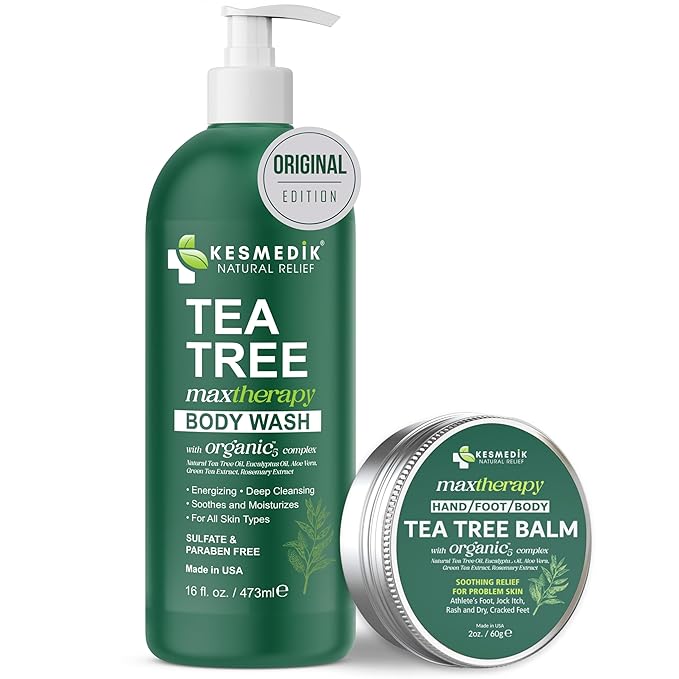 - Dual Defense & Cleanse Power: This bundle combines our Tea Tree Oil Body Wash and Balm for total body care—cleansing away impurities while hydrating and protecting skin prone to itching, rashes, eczema, ringworm, and athlete’s foot.