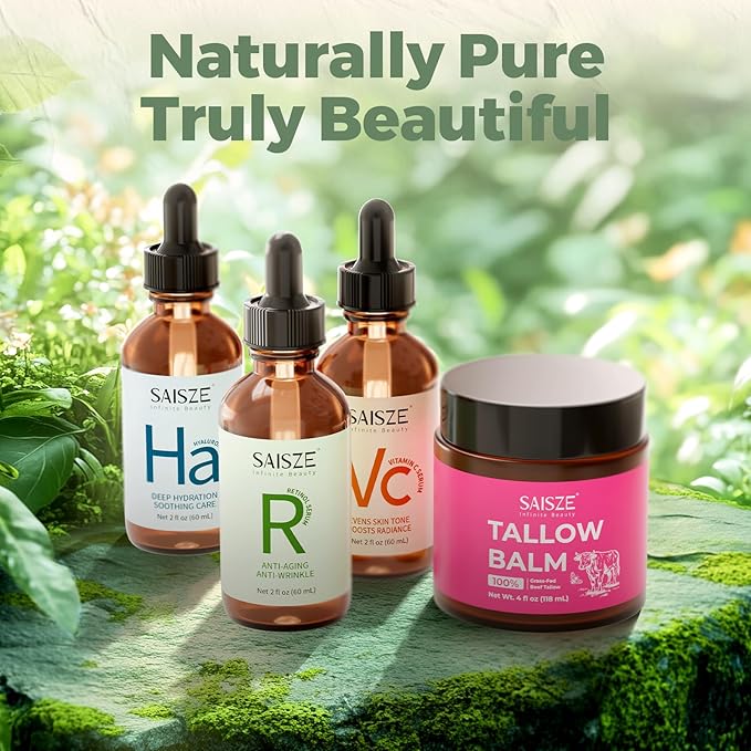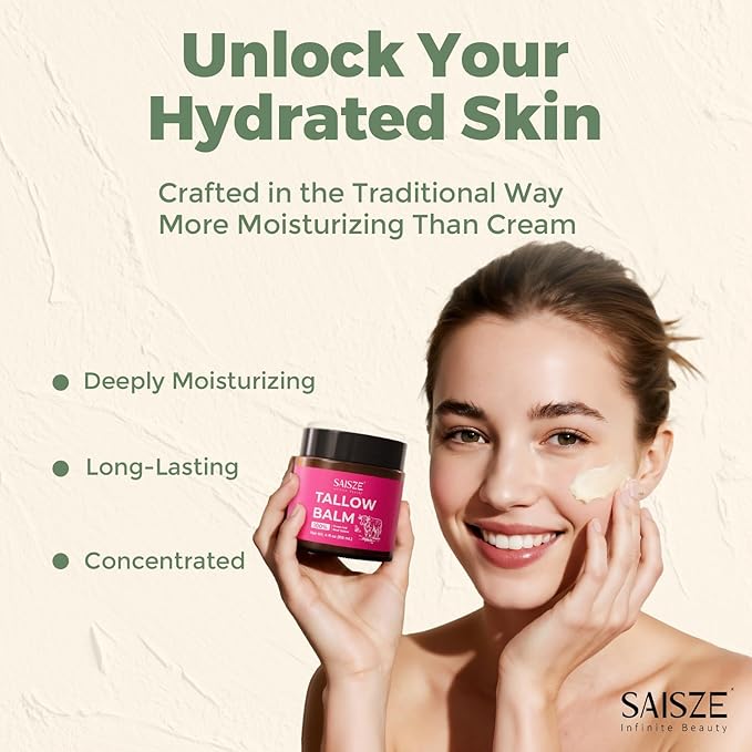 - SAISZE uses 100% grass-fed beef cattle, unlike industrially raised cattle fed grains. These grass-fed cows are nourished with a natural diet, producing tallow rich in healthy fatty acids and vitamins, ideal for deeply nourishing and moisturizing the skin