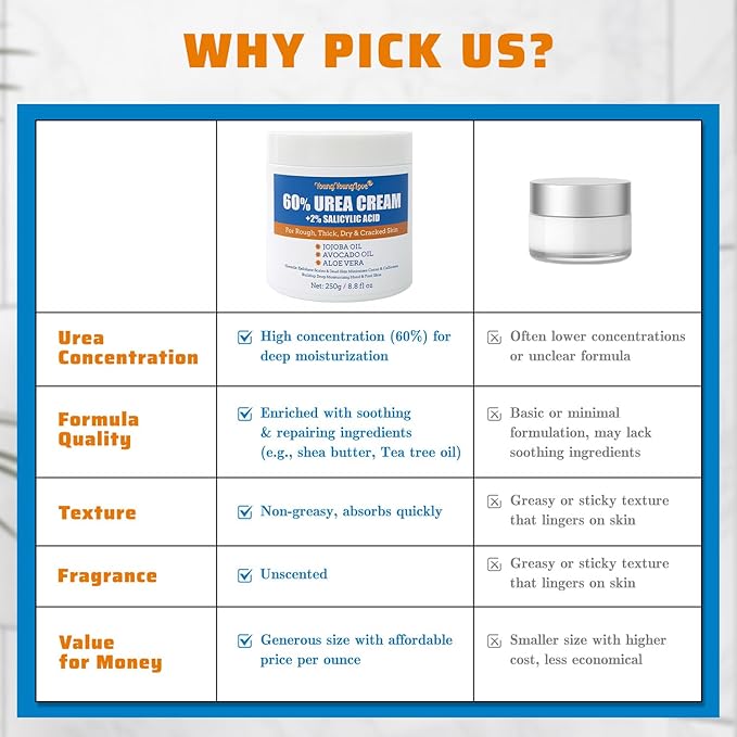 - 60 PERCENT UREA AND 2 PERCENT SALICYLIC ACID: 60% urea provides deep hydration and softens extremely dry, cracked skin. It helps reduce calluses and locks in moisture. 2% salicylic acid gently exfoliates dead skin cells, leaving the skin smoother.