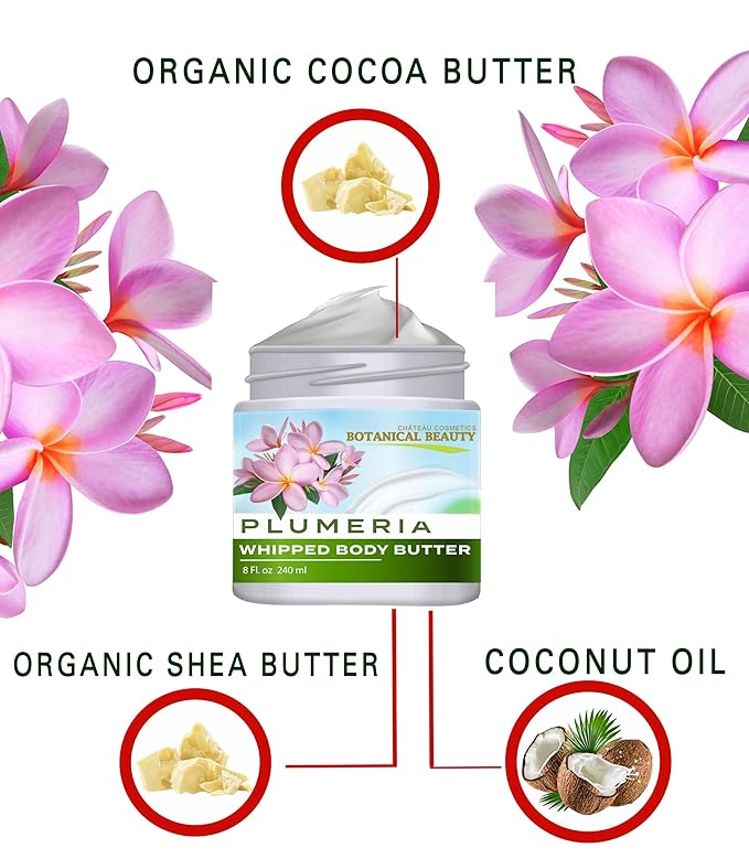 - Botanical Beauty PLUMERIA Whipped Body Butter with Shea Butter and Cocoa Butter is a delightful butter for skin, offering a blend of natural ingredients that provide luxurious hydration and rejuvenation. Perfect for anyone seeking a rich, nourishing butter, this body butter ensures a smooth, supple, and vibrant skin texture.