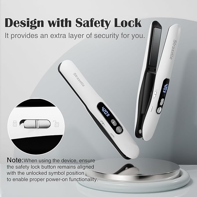- 【Intuitive Safety Lock Design】Side-mounted child lock must be slid to the "unlocked" position to activate power,to prevent accidental activation. ⚠️ NOTE:When the cordless flat iron is in the locked state, power cannot be turned on and used.