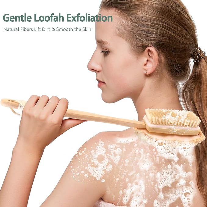- 【Dual-Sided Design for Exfoliation & Deep Cleansing】Use the bristle side as a dry brushing body brush to stimulate circulation and reduce the appearance of cellulite. Flip to the loofah side to create rich lather during wet use — ideal for deep pore cleansing and gentle exfoliation. This body scrubber exfoliator transforms your shower routine into a luxurious body scrub session.