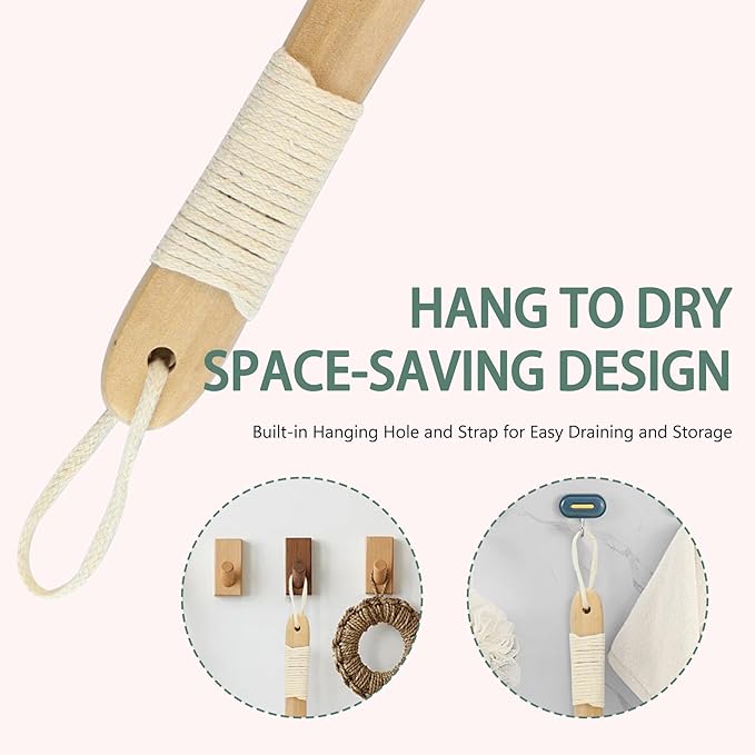 - 【Extra-Long Wooden Handle – Easy Back Scrubber for Shower】Made from natural wood, the long ergonomic handle helps you reach your entire back, legs, and feet effortlessly. With a built-in hanging loop and anti-slip rope, this back scrubber for shower and shower scrubber for body dries quickly and stores easily, saving bathroom space.