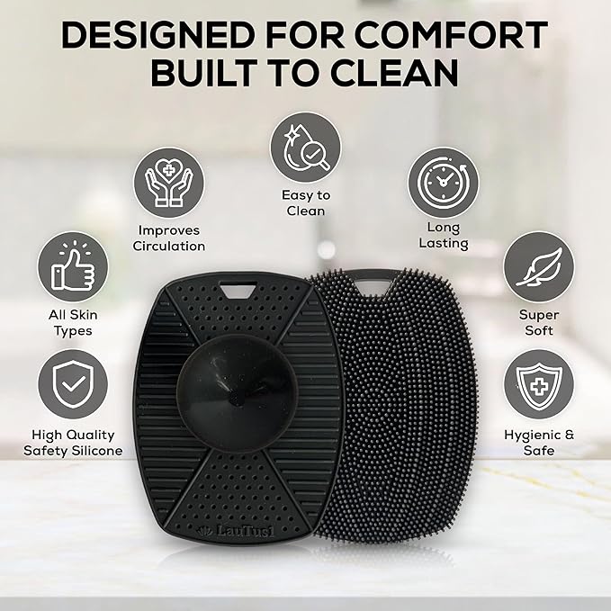 Silicone Body Scrubber – Exfoliating Shower Brush with Suction Handle & Hook, Soft Loofah for Men, Women, Babies, Gentle, Hygienic, Reusable - Graphite Black