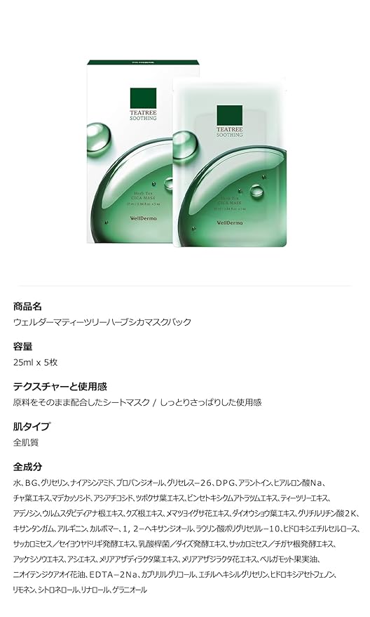 WELLDERMA Tea Tree Herb Soothing Mask Pack, 25ml x 5 Sheets – Hydrating & Refreshing Face Sheet Mask with Centella Asiatica & Green Tea Extract