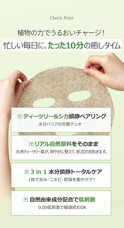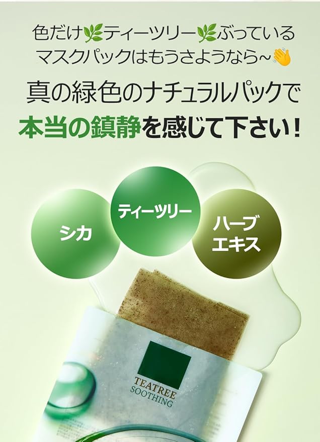 - Centella & Tea Tree Blend – Sheet mask infused with Centella Asiatica, Tea Tree, and Green Tea extracts for a refreshing and soothing care.