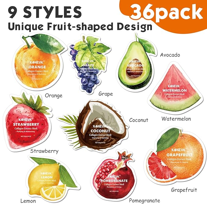 - 【36 Pack Fruit-Shaped Face Mask Set】Our face mask gift sets comes with 9 distinct fruit-shaped designs:watermelon,lemon,pomegranate,orange,avocado,coconut,strawberry,grape,and grapefruit,4 sheets face masks of each type.The soft facial mask is full of abundant collagen and essence,while its fresh fragrance relaxes mind and body,filling daily skincare with surprises and joy