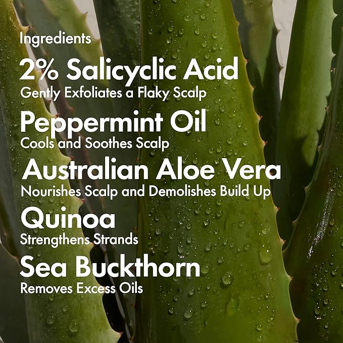 - INGREDIENTS: This powerful anti-dandruff shampoo features 2% Salicylic Acid to effectively eliminate flakes and reduce scalp buildup. Sea Buckthorn helps maintain a healthy scalp environment, while Peppermint Oil stimulates and invigorates for improved circulation at the roots. Hydrolyzed Quinoa deeply hydrates and soothes irritation, leaving your scalp refreshed and your hair silky-smooth and flake-free.