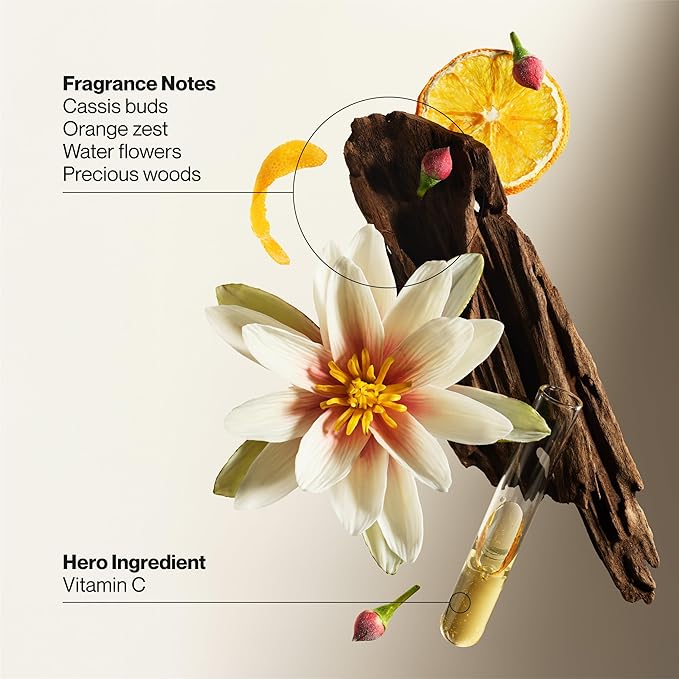 - FRESH SCENT GLOW-BOOSTING LOTION: With fragrance notes of cassis buds, orange zest, water flowers, and precious woods, this daily body lotion with vitamin C helps restore and maintain glowing, radiant skin throughout the day
