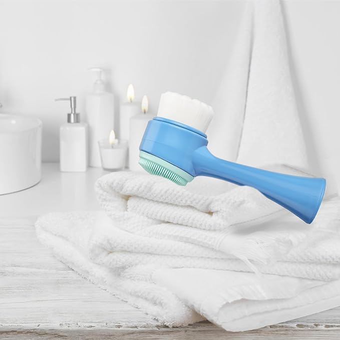 Face Brush 2 in 1, Facial Cleansing Exfoliating Scrubber Brush, Silicone Double Side Manual Face Wash Scrub Brush with Soft Fiber for Deep Pore Cleansing, Massaging, Skin Care,Blue
