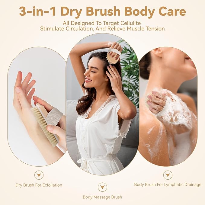 - 【3-in-1 Dry Brush Body Care】 This set includes a dry brush for cellulite, a dense-bristle dry brushing body brush for lymphatic drainage, and a body massage brush—all designed to target cellulite, stimulate circulation, and relieve muscle tension.
