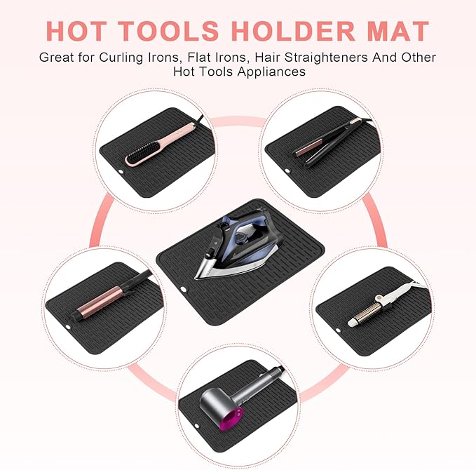 - Heat-Resistant Material: Our silicone mat for hair tools is made of heat-resistant silicone, which withstands temperatures up to 482℉(250℃), providing a reliable barrier to protect your countertops and vanity from the intense heat of curling irons, flat irons, hair straighteners and hot hair styling tools