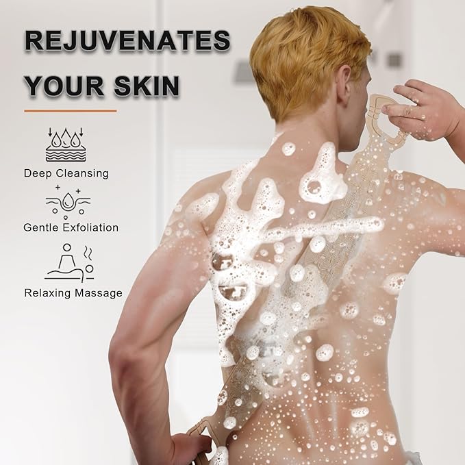 - A good partner for bathing: With our shower back scrubber for men, you don't need help from others. Mens washcloth is powerful enough to get the job done, and is perfect for daily body cleansing, exfoliation, and massage in the bath or shower