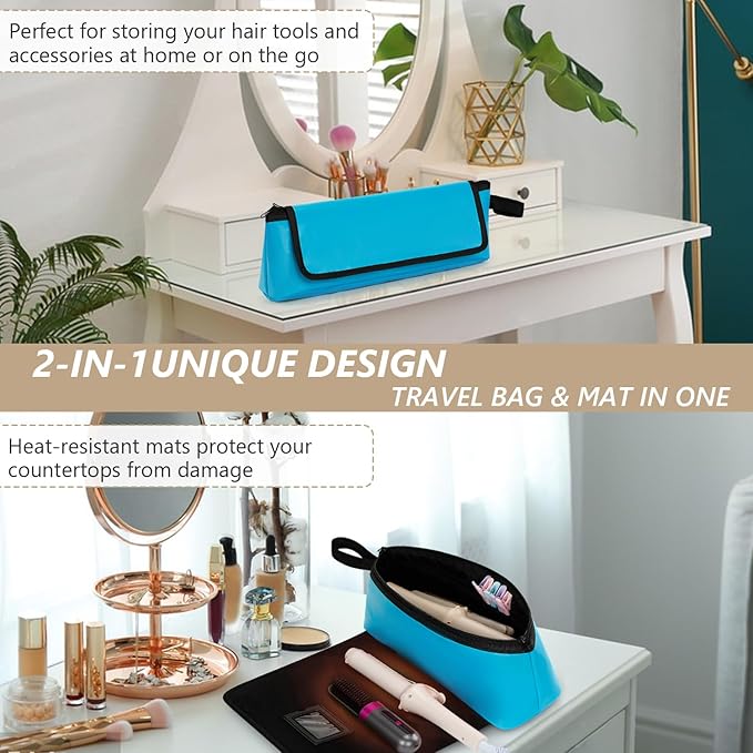 GNEGNI Hair Tools Travel Bag with Heat Resistant Mat, 2-in-1 Portable Hot Tools Organizer fits Curling Iron, Straightener & Hair Accessories, Travel Vacation Essentials(Blue/Pink) (Blue)