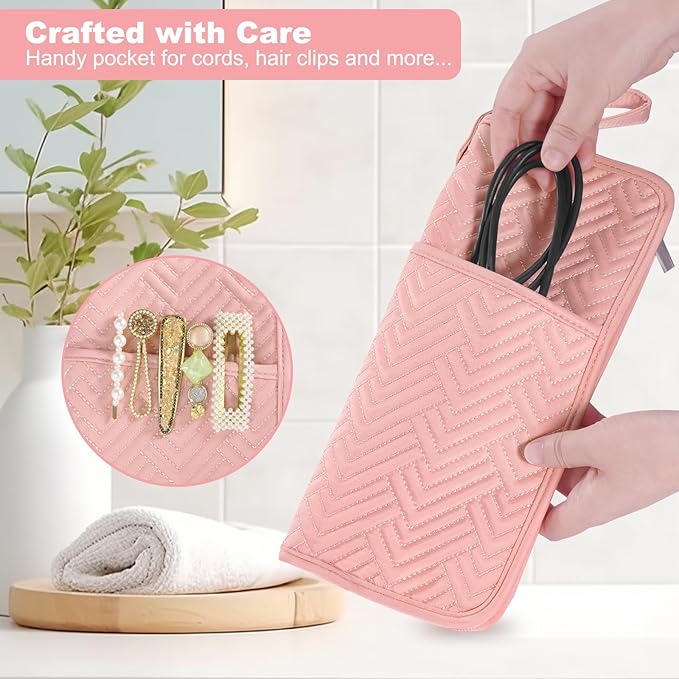 - Dual Pouch & Heat-Resistant Mat: This versatile 2-in-1 design works as a protective mat and a storage pouch. Safely stow hot styling tools right after use—no cooling time needed—to shield surfaces and ensure secure travel.