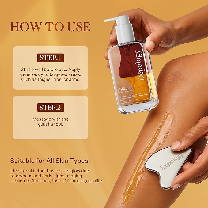 depology Caffeine Body Firming Serum Oil – Non-greasy Hydrating Body Glow Dual-Phase Oil for Dry, Aging Skin with Gua Sha Tool – Skin Tightening Oils with Squalane, Camellia & Caffeine – 5.07 fl oz