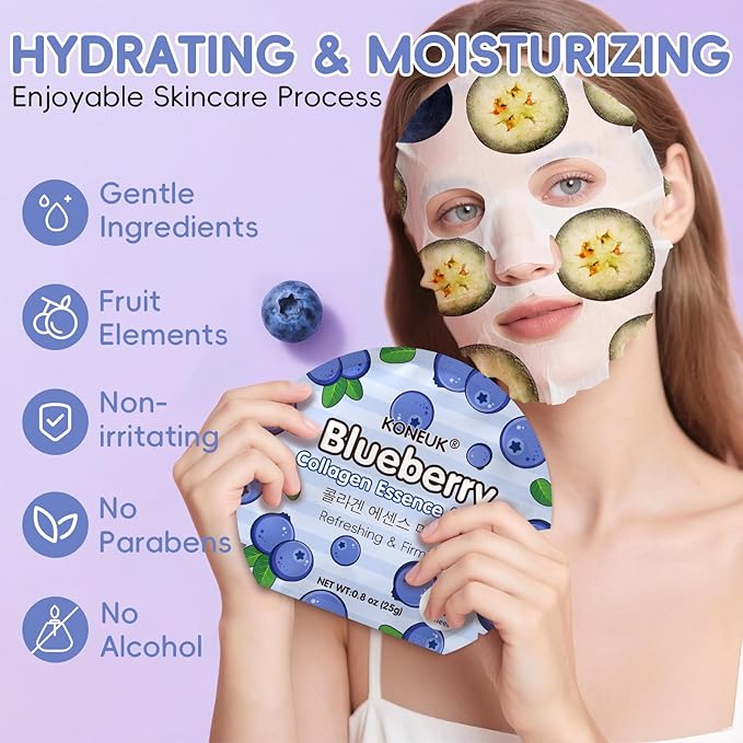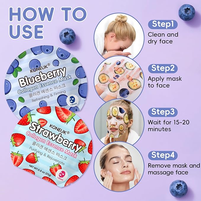 - 【Cute Fruit-Themed Design Elements】Putting on these face masks with cute fruit patterns like blueberry and lemon,you'll definitely be the center of attention at the skincare party! They not only replenish skin moisture,soothe and nourish to improve dryness,but also bring a good mood with their lovely designs.Whether used alone or shared with friends,they turn skincare into a fun and effective joyful experience