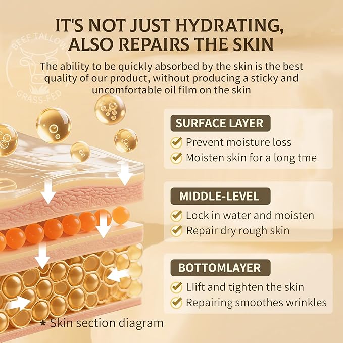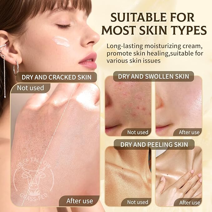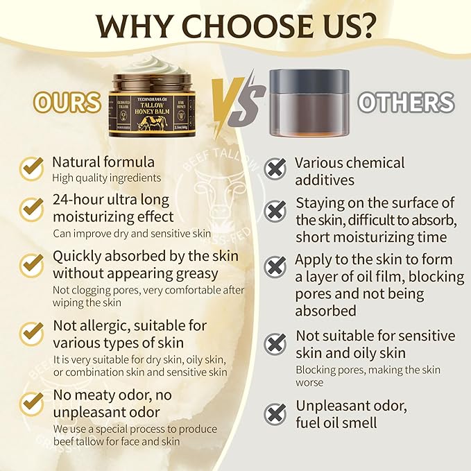 - 【Fast Absorption and Non Greasy】:This Tallow and Honey Balm is made from natural ingredients, which can be quickly absorbed by the skin without forming a sticky and uncomfortable oil film. It does not clog pores and leaves the skin feeling very refreshing and comfortable after application, with a tender and smooth texture. The scent is light and has no meaty odor, making it ideal for daily use
