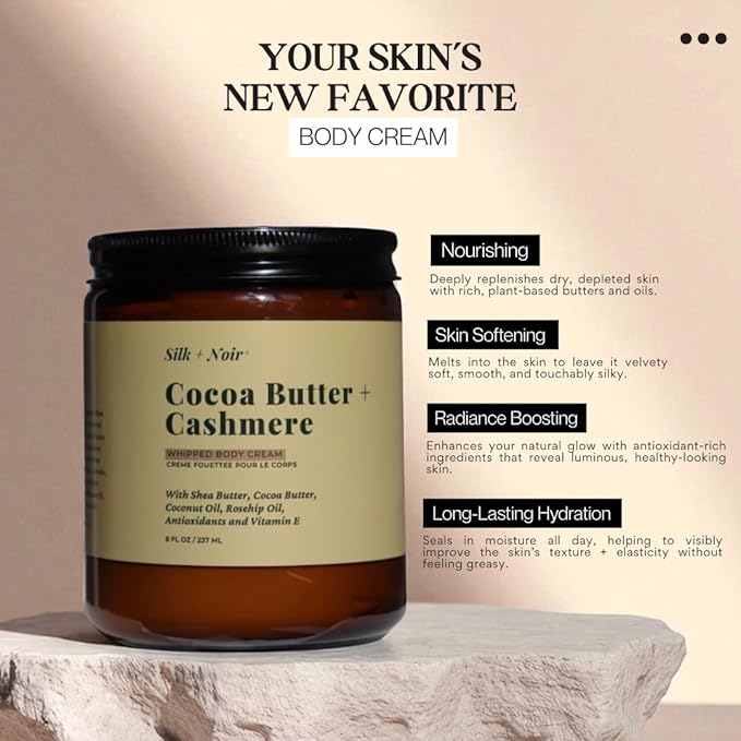 SILK + NOIR Whipped Body Cream | Moisturizing Body Cream For Glowing Skin | Hydrating, Non-Greasy Glow | Shea Butter, Cocoa Butter, Coconut Oil | Cocoa Butter + Cashmere, 8oz