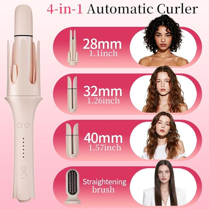 - 【4-in-1 Auto Hair Curler& Straightener 】This 4 in 1 Interchangeable automatic curling Iron set, 4 styling tools, 28mm,32mm,40mm roll, hair straightener brush,have two-way rotation function, requiring no special skills. You can easily switch between left and right curl directions: simply place your hair in the wand, press the auto-curling button, and it will wrap your hair evenly. It creates long-lasting curls in just 12 seconds.