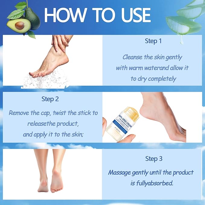 - Natural Ingredients:Foot balm contains urea, aloe vera, salicylic acid, and avocado oil. Urea foot cream has a microcrystalline texture with a frosty feel and a touch of water, ensuring it isn’t sticky. Heel stick offers fast absorption, a non-greasy, silky texture, and helps maintain the condition of hands and feet