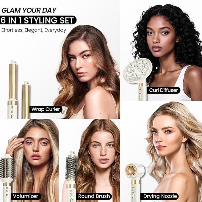 - 【6 Professional Tools - 1 Smart Device】Effortlessly transform your blow dryer into a versatile styler in seconds. Attachments including: Round Brush for blowouts. Wrap Curler for effortless waves. Volumizer for smooth, frizz-free finish.Diffuser for natural curls and reduce frizz, shiny finishes. Even airflow for gentle drying .The set is compatible with local voltage and plug.