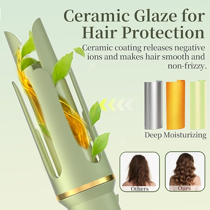 - 【Ionic Technology for Healthier Hair】This automatic curling iron is made with ceramic glaze that releases abundant negative ions, locking in moisture and preventing heat damage. It eliminates static, smooths frizz, and leaves hair soft and shiny.
