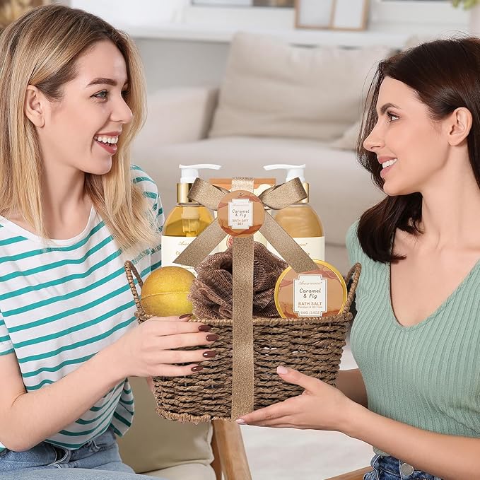 Christmas Gifts for Women Spa Baskets for Women Gift, Warm Caramel & Fig Bath Gift Set with Shower Gel Self Care Pampering Gifts for Mothers Day, Birthday, Anniversary Gift