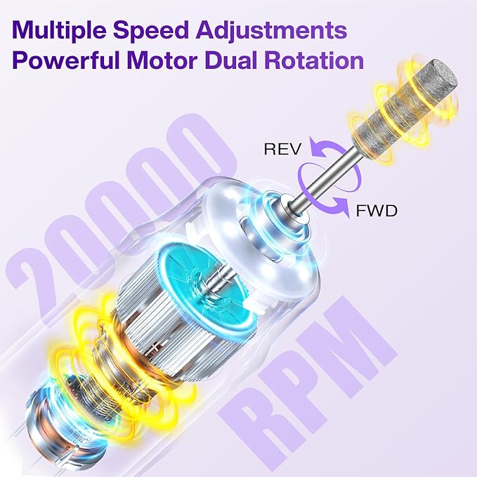 - 【10-in-1 Professional Nail Drill Set】 - Wireless nail drill, equipped with 10 different nail drills, 20 sanding belts, suitable for thick nails, grinding, carving, cutting, polishing, removing gel polish, dead skin, calluses and keratin layers. The included dust cover can effectively prevent dust from flying and easily remove nail dust and acrylic dust. Adjustable 10-speed manicure scrub, speed range: 2000-20,000 PRM, providing sufficient power for you to effectively polish acrylic nails and remove gel nails.