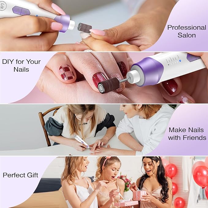 - 【What You'll Get】: This electric nail polish drill kit comes with 10 interchangeable drill bits, 20 sanding belts, and a Type-C charging cable. It will make your nails look as good as in a salon. This nail polish kit is suitable for doing manicures and pedicures for yourself, your family, the elderly, children, or beginners. It's a great idea as a Christmas gift or birthday present.