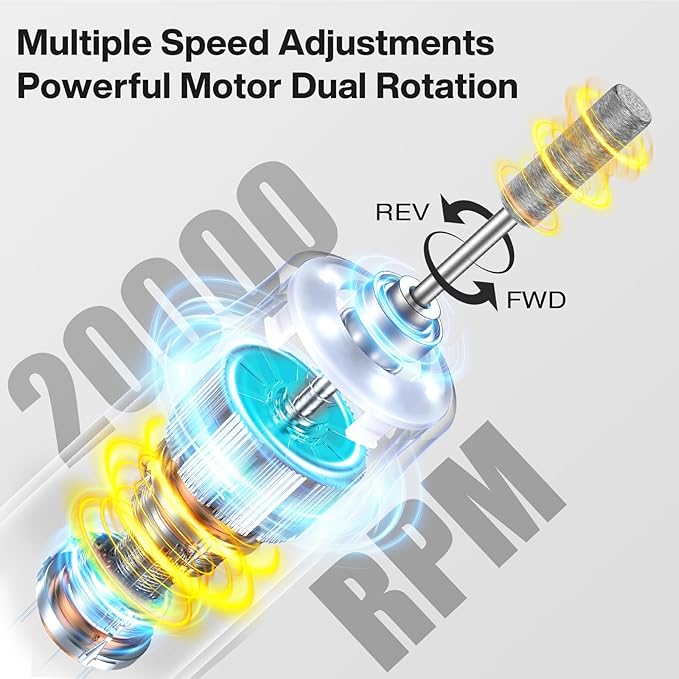 - 【Easy to Use】: A portable drill and nail machine with an ergonomic body design, lightweight, easy to operate, suitable even for beginners, comfortable to hold, with both forward rotation (R) and reverse rotation (L) directions. Adjustable nail file with a speed range of 2000-20000PRM, providing sufficient power for you to effectively polish acrylic nails and remove gel nails.