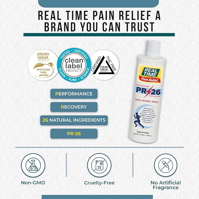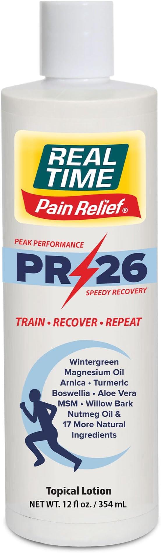 PR-26 by Real Time 12 fl oz Recovery Topical Lotion for Athletes - 26 Natural Ingredients Including Arnica, Magnesium Oil, Turmeric - Pre & Post Workout Muscle + Joint Rub for Your Athletic Lifestyle