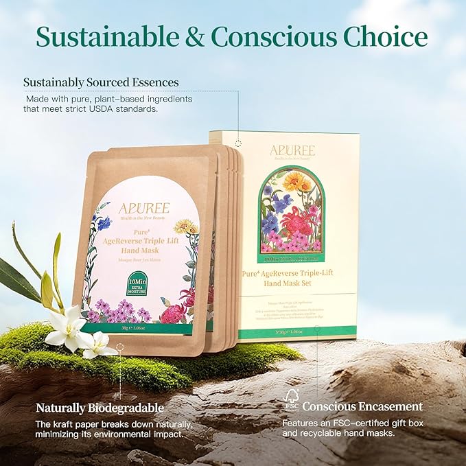 - The Gift of Timeless Grace (5pcs): Apuree hand mask set embodies refined self-care and a commitment to the planet. Its FSC-certified, recyclable packaging makes it the perfect gift for birthdays, an ideal companion for vacations, or simply a treat for yourself or a cherished one. Now with clinically-inspired ingredients for at-home symptom relief