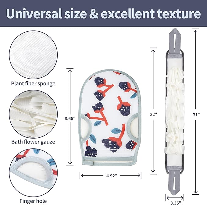 - 【Exfoliating Scrubber Set】This blue-flower set includes 1 exfoliating scrub mitt and 1 long bath scrub washcloth. The 2-in-1 mitt & washcloth are made of green and eco-friendly plant fiber sponge, one side is rough scrub surface suitable for exfoliating dead skin, and the other side is loofah mesh yarn for easy and long-lasting lather in the shower.