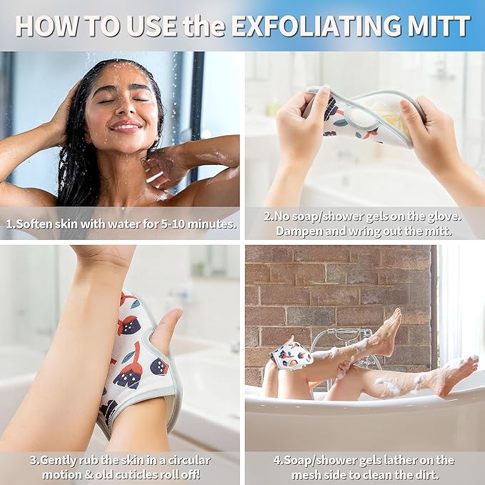 - 【Exfoliating Glove Usage】Soften skin with water for 5-10 minutes →No soap/shower gels on the glove. Dampen and wring out the mitt →Gently rub the skin in a circular motion & old cuticles roll off! →Soap/shower gels lather on the mesh side to clean the dirt →Apply body oil or moisturizer.