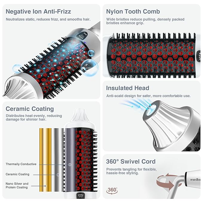 - [One Brush For Multiple Uses, Creating A Variety Of Styles] The heated round brush combines combing, styling, and hair care in one, combining anti-tangle bristles with dual PTC heating technology, quick styling, reducing tangles, saving time and efficiency. It can be used as a daily hair comb to easily create a variety of styles such as straight hair, inward curls, air bangs, fluffy curls, etc., to meet daily styling needs.