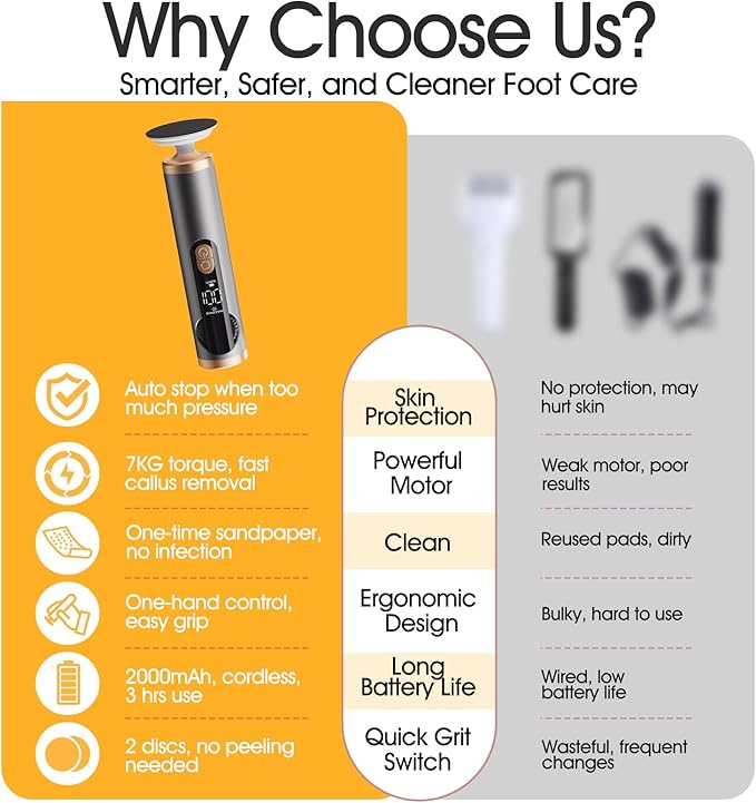 - 【Upgraded Electric Foot Callus Remover】This electric foot file effectively removes dry skin, dead skin, and calluses from your feet, and smooths the appearance of cracked heels, leaving them smooth and soft, provides a gentle yet powerful buff that leaves your feet feeling smooth and rejuvenated. The electric callus remover for feet is an excellent foot grooming tool for you, your family, and friends.