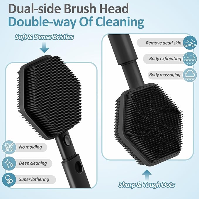 Silicone Back Scrubber for Shower, 16''-21''Extendable Shower Back Scrubber with Dual-Side Large Brush Head, 3-Length Back Brush Bath Brush with Strong Handle & Rich Foaming Bristles(Black)