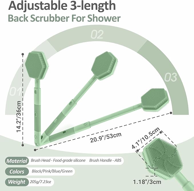 Silicone Back Scrubber for Shower, 16''-21''Extendable Shower Back Scrubber with Dual-Side Large Brush Head, 3-Length Back Brush Bath Brush with Strong Handle & Rich Foaming Bristles(Green)