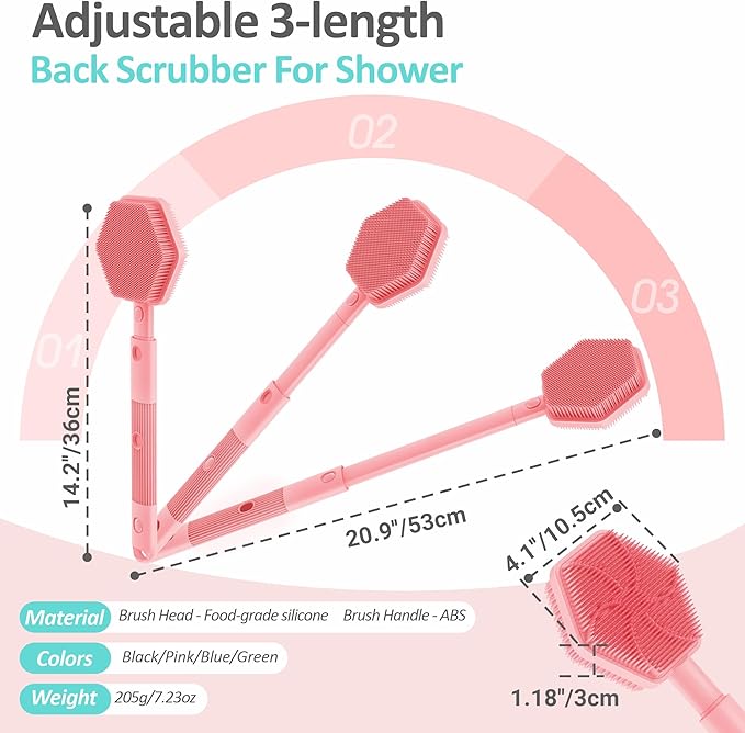 Silicone Back Scrubber for Shower, 16''-21''Extendable Shower Back Scrubber with Dual-Side Large Brush Head, 3-Length Back Brush Bath Brush with Strong Handle & Rich Foaming Bristles(Pink)