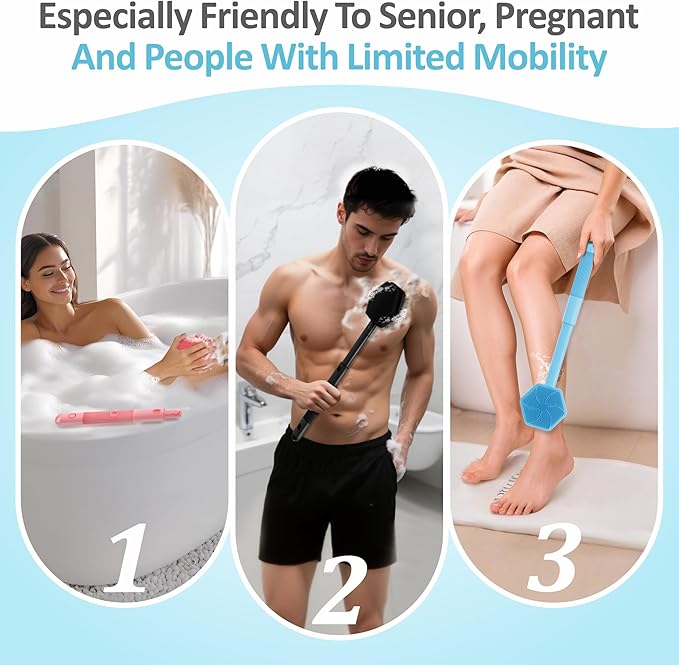 - 【BACK SCRUBBER - Adjustable 3-Length Extra-Long Handle】Back brush's handle can be adjusted to three different lengths to meet different needs. Shortest one is perfect for hand-hold brushing, medium length for scrubbing back and legs, longest one for brushing feet and toes without bending, which is especially friendly to seniors, pregnant and people with limited mobility. The unique extendable handle brings excellent non-slip experience to your shower!