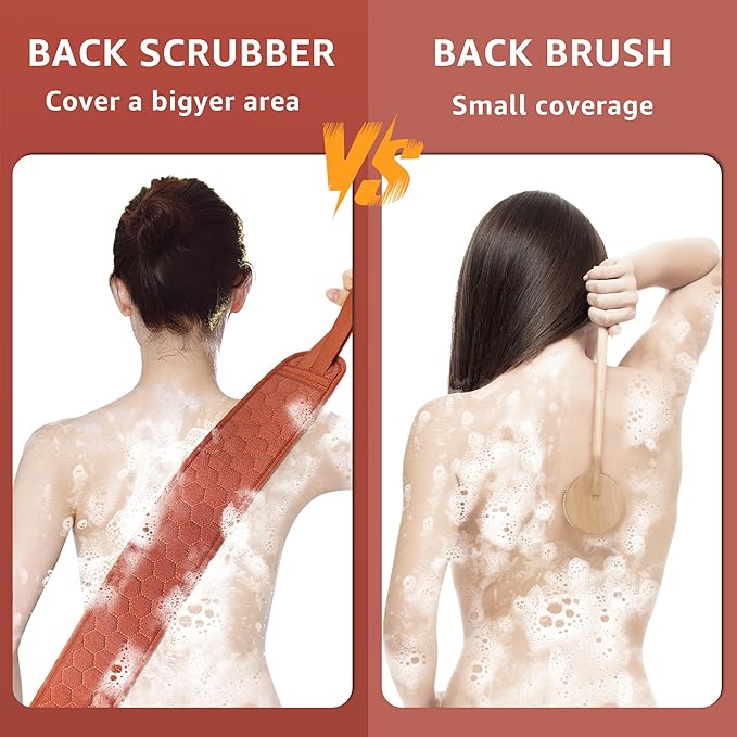 - [Extended Reach Design for Better Coverage] Unlike short cloths or stiff brushes, this extended exfoliating back scrubber solves the challenge of cleaning every inch of your body with ease. Its generous length ensures effortless access to areas like the mid-back and lower back that are often neglected, helping you achieve a full-body cleansing routine. Perfect for taller individuals or anyone seeking convenience, the extra length allows you to enjoy a more balanced grip and comfortable scrubbing motion. By combining functionality with thoughtful design, this product guarantees an enjoyable and thorough bathing experience